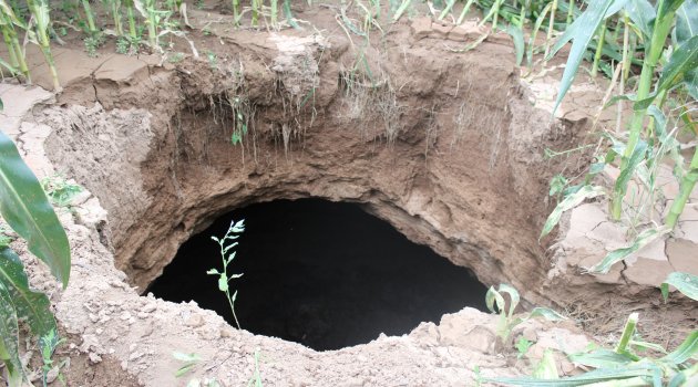 Konya’da bir mısır tarlasında 3 metre genişliğinde yaklaşık 10 metre derinliğinde oluşan obruk çiftçileri korkuttu.