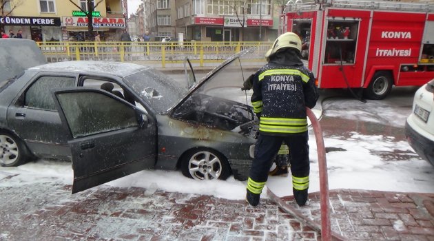 Konya’da seyir halindeki bir araçta çıkan yangın itfaiye ekipleri tarafından söndürülürken, otomobil kullanılmaz hale geldi.