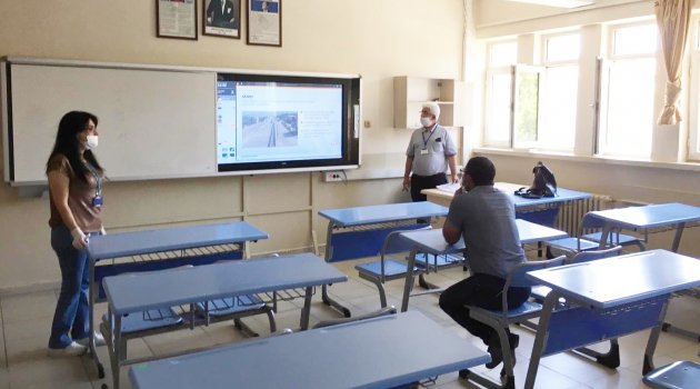 Sosyal mesafe gözetilerek yapılan sınavda hem sınava girecek adayların hem de gözetmenleri korumak için önlemler alındı. İlçe Milli Eğitim Müdürü Recep Bulut'ta sınıfları tek tek gezerek alınan tedbirler inceledi.