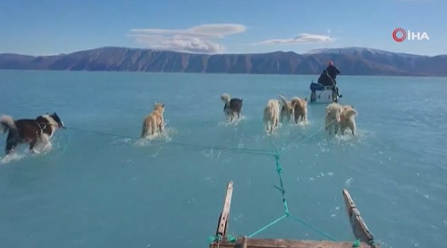 Danimarka’nın Grönland bölgesinde buzullarla ilgili araştırma yapan iklim bilimci Steffen M. Oslen’in kamerasına yansıyan kızaklarını çeken köpeklerin suda koştuğu anlar, iklim değişikliğinde gelinen son noktayı bir kez daha gözler önüne serdi.