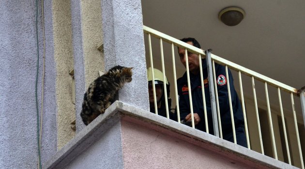 Denizli’nin Merkezefendi ilçesinde bir apartmanın 3. katındaki kullanılmayan daireye kuş yakalamak için çıkan ve iki gündür aşağı inemeyen kediyi itfaiye kurtardı.