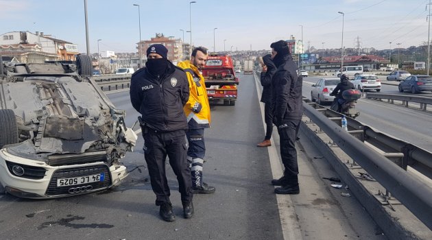 Küçükçekmece E-5 karayolunda aniden önüne çıkan kuşa çarpmamak için manevra yapan sürücünnün aracı bariyerlere çarparak takla attı.