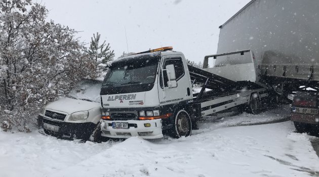 Bu esnada aynı istikamette seyreden ve kar nedeniyle kaymaya başlayan 26 GB 980 plakalı tır, önce çekiciye, ardından da hafif ticari araca çarpıp ters dönerek durabildi. Bu esnada tırın kaydığını gören çekici ve hafif ticari aracın sürücüleri, kendilerini ağaçlık alana atarak kazadan kıl payı kurtuldu. Herhangi bir yaralamanın yaşanmadığı kazada maddi hasar meydana geldi. Kaza dolayısıyla trafik bir süre tek şerit üzerinden kontrollü bir şekilde sağlandı.