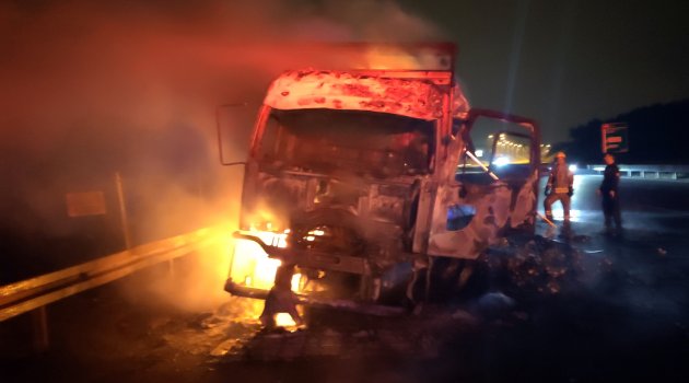 Kuzey Marmara otoyolunda meyve sebze yüklü bir araç alev alev yandı. Sürücü olaydan yara almadan kurtuldu.