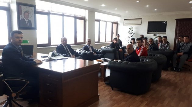 Güreş Antrenörü öğretmen Onur Altunbey, Halk Eğitim Merkezi Müdürü Aziz Ayaz ve İlçe Milli Eğitim Müdür Vekili Mustafa Akkaya, Kale Kaymakam Vekili Nurullah Kaya’yı makamında ziyarette, öğrencilerin başarısı konuşuldu.