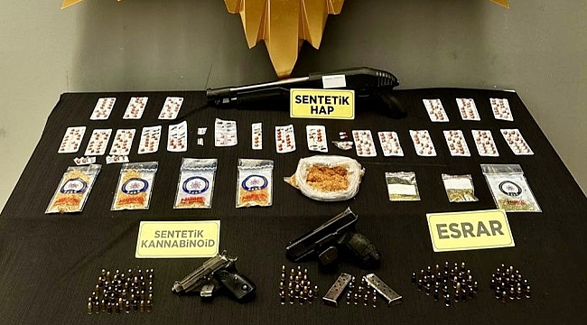 3 aylık fiziki takip sonucunda düzenlenen operasyonda bin 33 adet sentetik ecza, 102,83 gram sentetik kannabinoid maddesi, 17,36 gram esrar maddesi, 9,36 gram metamfetamin maddesi, 2 adet ruhsatsız tabanca, 5 adet şarjör ve 140 adet fişek ve 1 adet pompalı ele geçirilmişti.