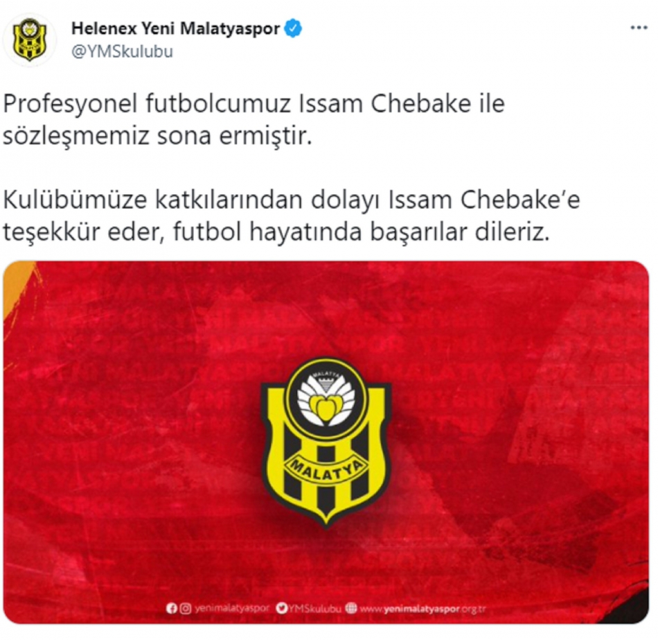 Yeni Malatyaspor, sözleşmesi sona eren Issam Chebake ile yeni sözleşme imzalanmadığını açıkladı.