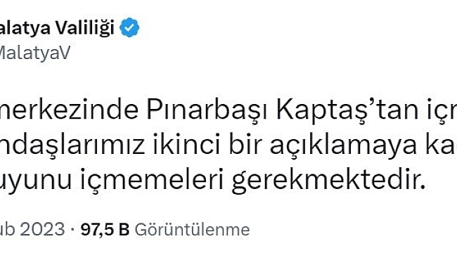 Malatya'da Valiliği tarafından sosyal medya hesabında yapılan açıklamada, "Malatya merkezinde Pınarbaşı Kaptaj'tan içme suyu alan vatandaşlarımız ikinci bir açıklamaya kadar şebeke suyunu içmemeleri gerekmektedir" denildi.