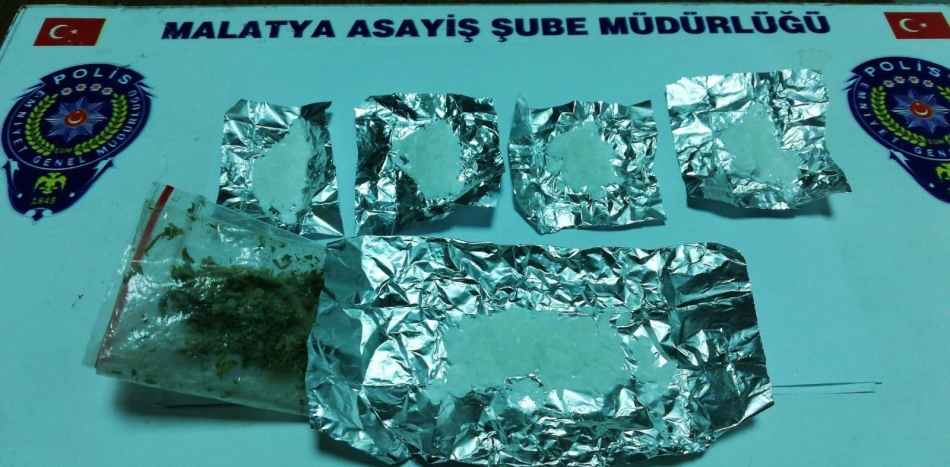 Malatya polis ekiplerince yapılan çalışmalarda yaklaşık 70 gram çeşitli maddelerden oluşan uyuşturucu ele geçirildi.