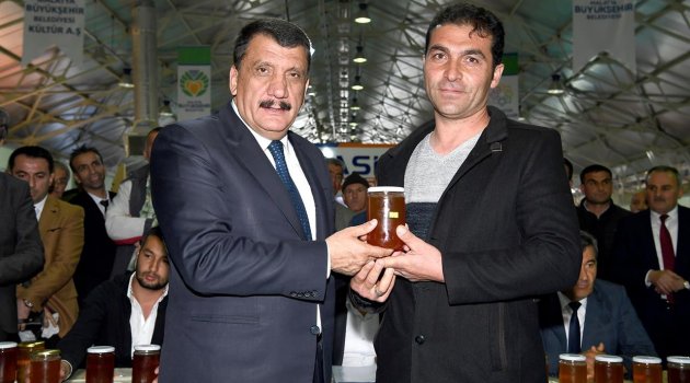 ‘En İyi Bal Yarışmasında’ birinci olan Hüseyin Buğday’a birincilik ödülünü Büyükşehir Belediye Başkanı Selahattin Gürkan verdi.