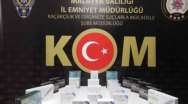 Malatya il Emniyet Müdürlüğü İl Emniyet Müdürlüğü Kaçakçılık ve Organize Suçlarla Mücadele (KOM) ekiplerince "5607 SKM" çerçevesinde yapılan çalışmalarda 170 kilogram bandrolsüz tütün, 27 bin 800 dal makaron, 17 litre el yapımı sahte alkol, 176 adet cinsel içerikli ürün, 9 adet gümrük kaçağı parfüm, 6 adet elektronik nargile, 1 adet elektronik sigara dolum makinesi, 16 adet kablosuz kulaklık ile 7 adet gümrük kaçağı çizim kalemi ele geçirildi.