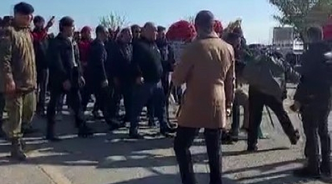 Bu esnada cenazeye katılan vatandaşlar da alkış ve tekbirlerle çelengi parçalayan şahsa destek vererek, "Şehitler Ölmez, Vatan Bölünmez ve tekbir" sloganları attı.