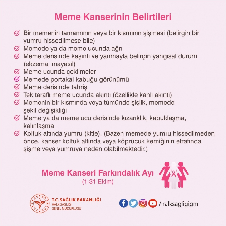 Kadınların korkulu rüyası olan meme kanserinin belirtileri konusunda yapılan açıklamada ise kitlenin önemine dikkat çekilip, “Meme kanserinin en sık rastlanan belirtisi, memede ağrısız, zamanla büyüyen bir yumrunun (kitlenin) ele gelmesi, hissedilmesidir. Ayrıca ele gelen yumru (kitle) olsa da olmasa da aşağıdaki belirtiler de meme kanserinde görülebilmektedir. Memede ya da meme ucunda ağrı, Meme derisinde kaşıntı ve yanmayla belirgin yangısal durum (ekzema, mayasıl), meme ucunda çekilmeler, Memede portakal kabuğu görünümü, Meme derisinde tahriş, Tek taraflı meme ucunda akıntı- özellikle kanlı akıntı, Koltuk altında yumru (kitle), Memenin bir kısmında veya tümünde şişlik, memede şekil değişikliği, Meme ya da meme ucu derisinde kızarıklık, kabuklaşma, kalınlaşma şeklinde ortaya çıkar” denilerek, bunlara karşı dikkatli olunması istendi.