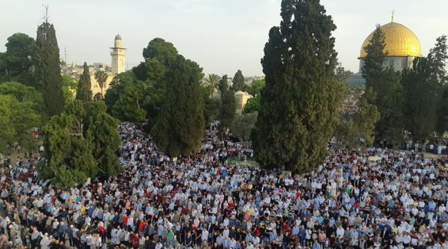 Binlerce Filistinli, Ramazan Bayramı'nın ilk gününde Mescid-i Aksa'da bayram namazı kıldı.