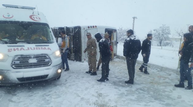 Elazığ'da kar nedeniyle kayganlaşan yolda midibüs devrildi, 16 kişi yaralandı.