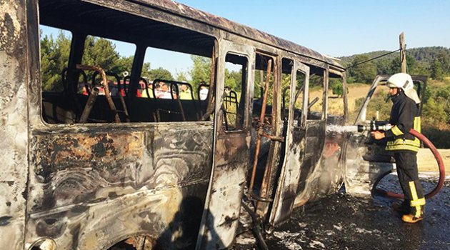 Muğla’da ticari bir minibüsün motor bölümündeki kabloların kısa devre yapması sonucu çıkan yangında araç tamamen yandı.