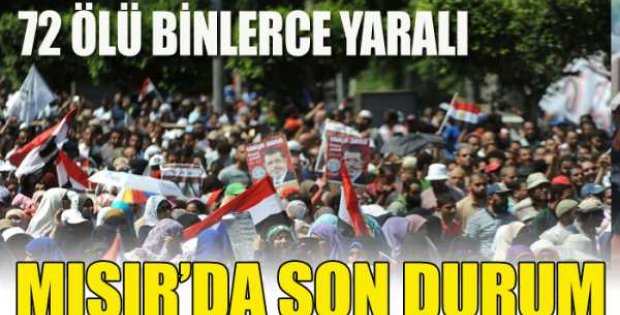 Hastane yetkililerinden edinilen bilgiye göre, 30 Haziran'da devrik Cumhurbaşkanı Muhammed Mursi taraftarları ile karşıtlarınca düzenlenen gösterilerde ve bunları takip eden olaylarda 72 kişinin hayatını kaybetti, binin üzerinde de yaralı var.Dün 13 kişi, bugün de 12 kişinin öldürülmesiyle ölü sayısı 72'ye yükseldi. Hayatını kaydedenler arasında doğrudan başına ve vücudunun çeşitli bölgelerine aldığı kurşun darbesiyle hayatını yitirenler bulunuyor.