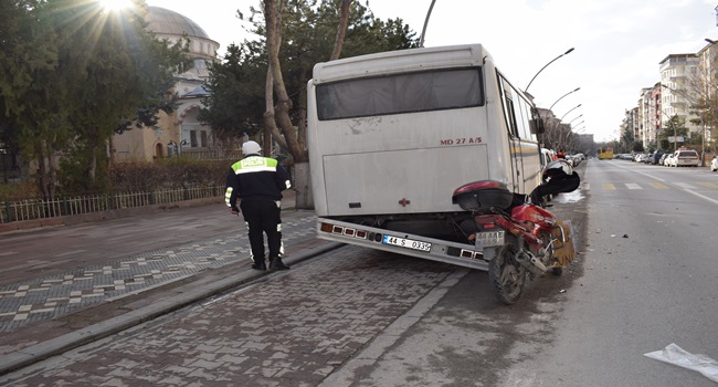 Edinilen bilgilere göre Mehmet Buyruk Caddesi üzerinden kent merkezine seyir halinde olan Y.T. idaresindeki 44 AAE 665 plakalı motosiklet sürücüsünün direksiyon hakimiyetini kaybetmesi sonucunda yol kenarında park halinde olan 44 S 0335 plakalı servis otobüsüne çarptı.Çarpmanın etkisi ile yola savrulan motosiklet sürücüsü Y.T. yaralandı.İhbar üzerine olay yerine polis ve sağlık ekipleri sevk edildi.