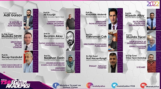 MTSO'nun üyelerine sunulan eğitim ve bilgilendirme hizmetlerinin tek çatı altında yönetilmesi amacıyla oluşturulan 'Malatya TSO Eğitim Akademisi' ilk günden bu yana birçok verimli çalışmaya imza attı. Korona virüs salgınıyla birlikte oluşan mesafeli sisteme ayak uyduran Malatya TSO Eğitim Akademisi, yüz yüze gerçekleştirdiği çalışmalarına farklı bir boyut kazandırdı. Oluşturduğu stüdyosunda, en yeni teknolojik cihazları kullanarak çekimler yapan akademi, eğitim videolarını dijital platformlar aracılığıyla üyelerinin ve tüm kamuoyunun bilgisine sunuyor. Pandeminin başladığı ilk günden bu yana birbirinden değerli akademisyenleri ağırlayan akademi 2022 yılında da TSO üyelerinin yeniliklerden haberdar olması, finansal, yönetimsel, koordinasyon sorunlarının iyileştirilmesi ve dijital dönüşüme ayak uydurabilmeleri için alanında uzman konukları ağırlamaya devam edecek.
