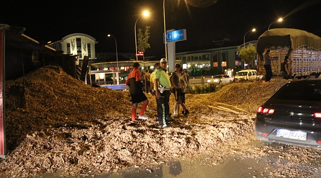Odun talaşı yüklü tır devrildi!