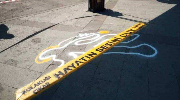 Kamu ve sivil toplum kuruluşları ortaklığıyla hazırlanan 'Hayatın Sesini Duy' projesi uygulamalı olarak tanıtıldı. Vatandaşların yoğun olarak kullandığı geçiş güzergahına, yürürken ve trafikteyken telefon ve kulaklık takmanın zararını anlatan olay yeri çizimi herkesi şaşırttı.