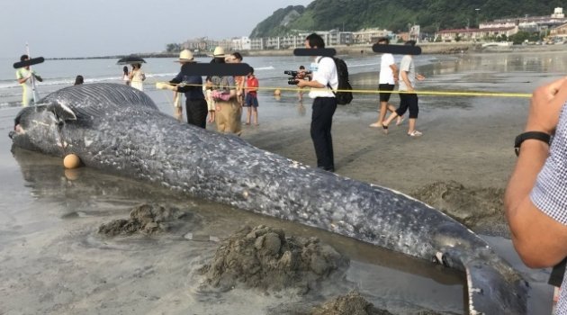Japonya'da dev bir mavi balina, Kamakura şehri sahillerinde karaya vurdu.