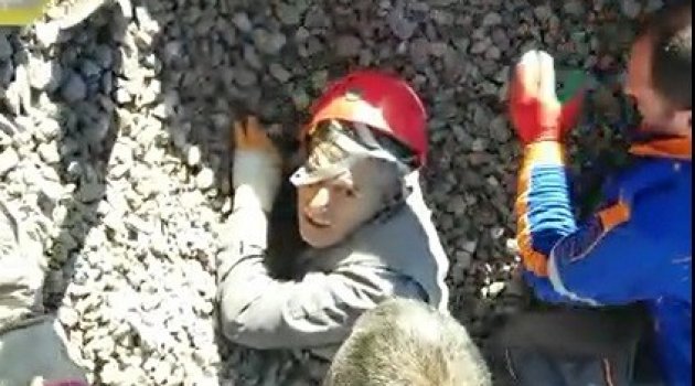 Kayseri'de çöken çatında mucura kafasına kadar gömülen işçiyi kurtarmaya çalışan ekipler zamanla yarıştı. İşçinin kurtarılma anı başka bir işçi tarafından saniye saniye görüntülendi.
