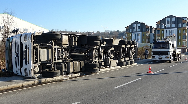 Ordu’nun Altınordu ilçesinde kontrolden çıkan boya yüklü tır devrildi.