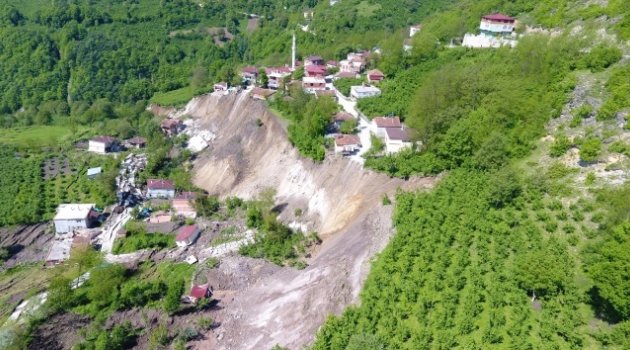 Heyelanın olduğu ve 15 evin yıkıldığı bölgede tedirginlik sürerken, olayın büyüklüğü havadan görüntülendi.