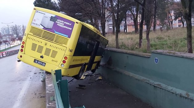Bursa'da sürücüsünün kontrolünden çıkan otobüs köprüyü kavşakta asılı kaldı.