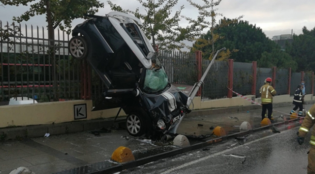 Kadıköy'de sürücüsünün direksiyon hakimiyetini kaybettiği otomobil refüje çarptıktan sonra karşı şeride geçerek demir parmaklıklarda asılı kaldı. Havada asılı kalan otomobilde bulunan sürücü ağır yaralandı. Kaza nedeniyle trafik yoğunluğu yaşandı.