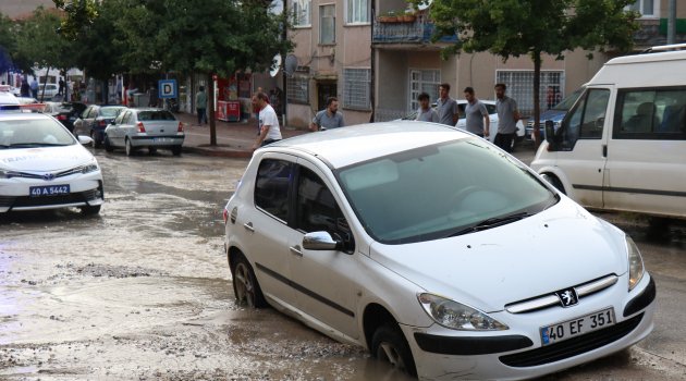 Kırşehir'de aniden bastıran yağmur yolun çökmesine neden oldu. Yolun çöktüğünü göremeyen bir sürücü ise aracıyla çukura saplandı.