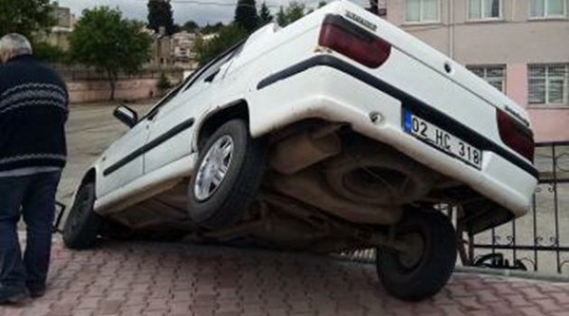 Edinilen bilgilere göre, Kap Cami Mahallesi Atatürk Stadyumu yakınlarında sürücüsü öğrenilemeyen 02 HC 318 plakalı otomobil, sürücüsünün direksiyon hakimiyetini kaybetmesi sonucu yol kenarında bulunan Mimar Sinan Ortaokulu bahçesi istinat duvarı üzerine çıkarak burada askıda kaldı.