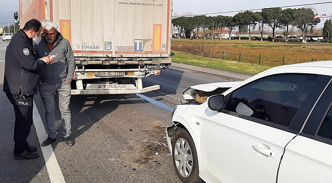 Kaza, Samsun'un Tekkeköy ilçesi Samsun-Ordu karayolunun 53. kilometresinde bugün meydana geldi. Edinilen bilgiye göre, İdris A.(56) idaresindeki 34 BDZ 903 plakalı otomobil, kavşakta kırmızı ışıkta bekleyen Selim A.'nın kullandığı 34 UL 1194 çekici plakalı tırın 34 UL 1195 plakalı dorsesine arkadan çarptı. Kazada otomobil sürücüsü İdris A. ile araçta bulunan Erdal G.(50) yaralandı. Yaralılar, 112 ekiplerince ambulansla özel bir hastaneye kaldırılarak tedavi altına alındı.