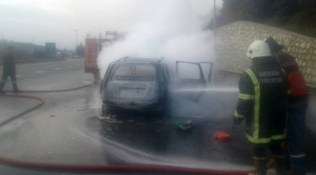 Mersin’in Tarsus ilçesi TEM otoyolunda seyir halindeki otomobilin motor kısmı bilinmeyen nedenden alev aldı.