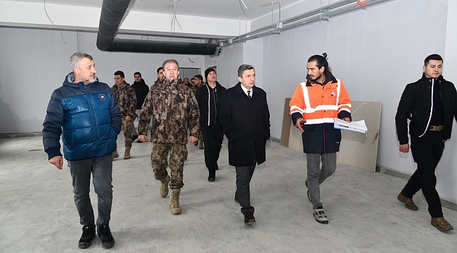 Emniyet Genel Müdürlüğü tarafından ihale edilen ve Bulgurlu Mahallesi'nde inşaatı süren Özel Harekat Bölge Müdürlüğünde incelemede bulunan Vali Hulusi Şahin, İnşaat Proje Müdürü Temel Özyazıcı'dan inşaat çalışmalarında gelinen son durum ve proje hakkında genel bilgi aldı.