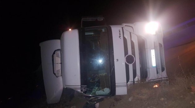 Kaza, dün saat 23.30 sıralarında Kulu Konya karayolunun Günahkar yaylası yakınlarında meydana geldi. Edinilen bilgiye göre, İ.D. idaresindeki 42 GR 379 plakalı pancar yüklü tır, sürücünün viraja girdiği sırada direksiyon hakimiyetini kaybetmesi sonucu kontrolden çıkarak şarampole devrildi. Yan yatan tırdan yaralı halde kendi çabasıyla çıkan sürücü İ.D., polise ve sağlık ekiplerine haber verdi. Yaralanan sürücü olay yerine sevk edilen ambulansla Kulu Devlet Hastanesine kaldırılarak tedavi altına alındı.