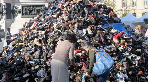 Fransa'nın başkenti Paris’te kara mayını ve misket bombası kurbanlarına destek için Republique Meydanı'nda ayakkabı piramidi oluşturuldu. Ayakkabılardan oluşan piramidin yanında protestoculara destek için kısa sürede 60 bin imza toplandı.