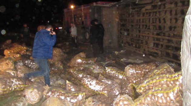 Kazayla birlikte yola savrulan patatesler işçiler yardımı ile başka bir kamyona yüklenirken kaza ile ilgili soruşturma başlatıldı.