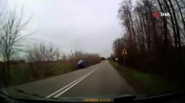 Polonya’da tarladan koşarak yolun karşısına geçmek isteyen geyik bir anda yola fırlayınca seyir halindeki araca çarptı. Araç takla atarak yoldan çıkarken, çarpmanın etkisiyle yaralanan geyik kaçtı.