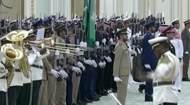 Rusya Devlet Başkanı Vladimir Putin başkanlık döneminde 2. kez Suudi Arabistan'a resmi ziyaret gerçekleştirdi. Dün gerçekleşen ziyarette Putin, Riyad'ta resmi törenlerle karşılandı. Ardından Putin ve Suudi Arabistan Kralı Salman El-Yemame Sarayı'na birlikte geçti. Rusya lideriyle Arabistan kralının görüşmesinden önce sarayda yapılan karşılama töreninde ise ilginç bir olay yaşandı. Suudi Arabistan krallık bandosu önce kendi milli marşlarını çaldı. Ardından ise bando Rusya milli marşını çalmaya başladı. Fakat Suudi Arabistan bandosunun Rusya milli marşı performansı başladığı gibi gitmedi. O sırada kanallar canlı yayındayken Rusya lideri Putin'in gerildiği görüldü. Kral Salman ise olayın farkında olmadan duruşuna devam etti.