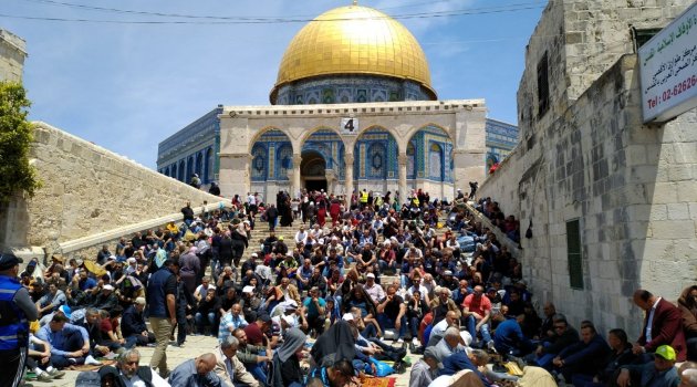 Binlerce Filistinli sabahın erken saatlerinden itibaren İsrail işgali altındaki Doğu Kudüs'te bulunan Mescid-i Aksa Camii'ne akın etti.