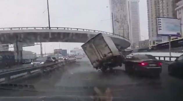 Rusya’nın başkenti Moskova’nın Begovaya çevre yolunda ilerleyen bir kamyon sola manevra yapınca soldan gelen minibüs ile önündeki otomobilin arasında kaldı. Kamyonun minibüse temas etmesiyle birlikte kamyon sürücüsü aracın hakimiyetini kaybetti.