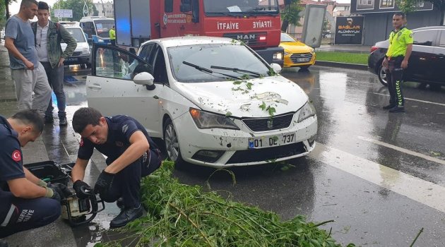 Sakarya'da şiddetli yağış esnasında ağaç aracın üzerine devrildi