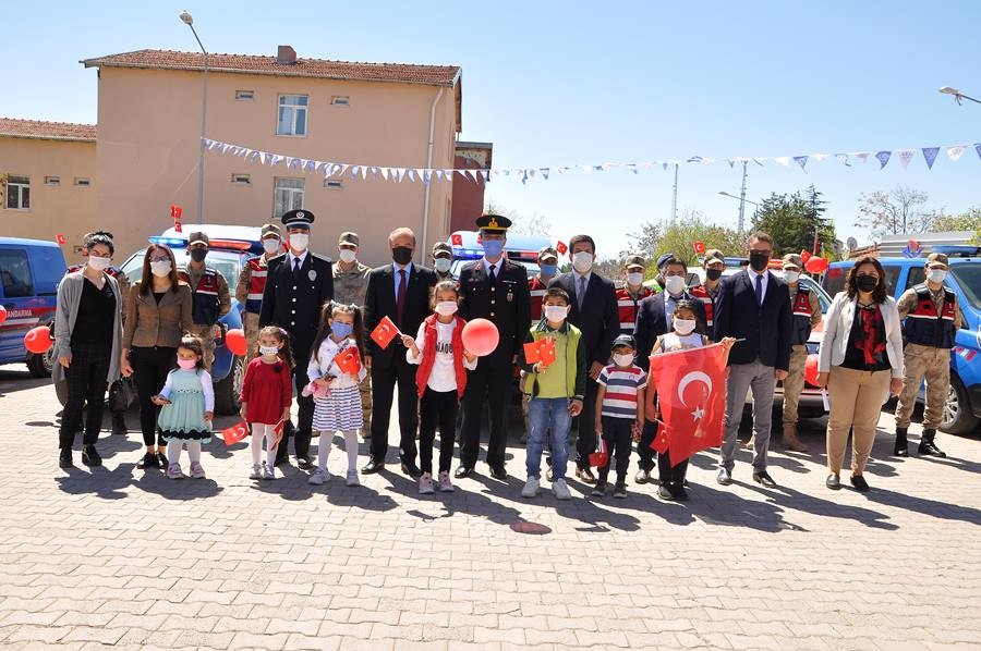 Bu arada, bu yıl korona virüs salgını nedeniyle törene öğrenciler katılmazken, ilçede jandarma komutanlığı tarafında resmi araçlarıyla konvoy düzenlendi. Jandarma kapı kapı dolaşarak çocukların bayramını evlerinde kutladı. Jandarma görevlileri, çocuklara bayrak hediye edip, kek ve çikolata ikramında bulundular.