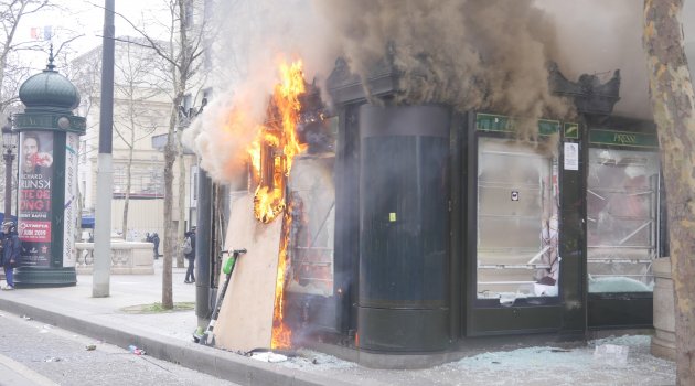 Fransa'da Sarı Yelekliler eylemlerine devam ediyor. Sabah saatlerinde başkent Paris’in çeşitli tren garlarında bir araya gelerek Sarı Yelekliler, Champs-Elysees caddesinde toplandı. Cadde üzerindeki kahve ve restoranları tahrip eden eylemciler, camları kırarak sandalye ve masalarını cadde ortasında ateşe verdi.