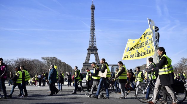 Cumartesi günü 14’ncü kez sokağa inen Sarı Yelekliler, 17 Kasım 2018’de başladıkları eylemlerinin 3’üncü ayını kutlamak için Pazar günü sokağa indiler. Başkent Paris’te Pazar sabahı Champs-Elysees caddesinde toplanan göstericiler, Eyfel Kulesi civarında bulunan Fransız işverenler kuruluşu MEDEF önünde gösteri yapacaklarını açıklamıştı. Polis ve bilhassa, atlı polisler göstericileri MEDEF binası yakınına yaklaştırmadı. Eylemcileri Eyfel Kulesinin etrafındaki yeşil alana toplamayı başaran polis, eylemcilerin alandan çıkmasını engelledi. Eylemciler Eyfel Kulesinin etrafındaki geniş parka yayılınca, gösterinin etkisi azaldı.