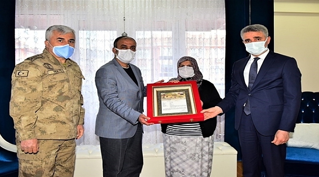 İl Jandarma Komutanı İnce de Jandarma Genel Komutanlığınca hazırlanan Taziye Mesajı ve Hizmet Anısını şehidin babası Gürsel Özbey’e takdim ederek, başsağlığı diledi.