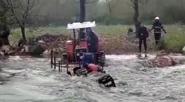 Gaziantep'te tarladan dönen biri çocuk 4 kişilik ailenin bulunduğu traktör, bir anda taşan dere sularının arasında kaldı. Dakikalarca suyun içerisinde mahsur kalan aile, başka bir traktör yardımıyla kurtarıldı