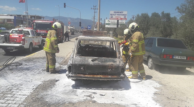 Edremit'te seyir halindeki araç elektrik kontağından çıktığı tahmin edilen yangında, cayır cayır yandı.